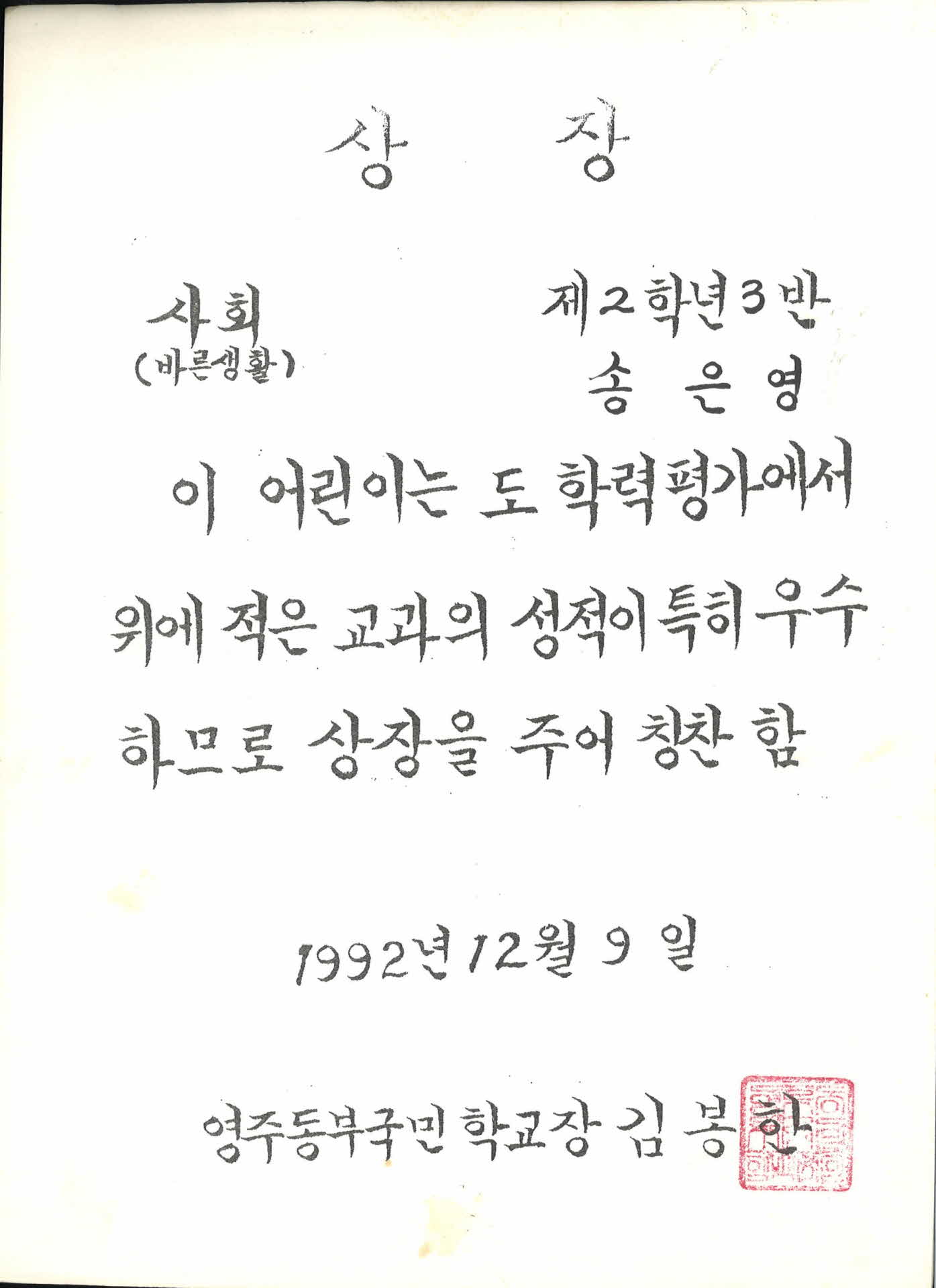 | 기록물명 | 1992년 동부국교 학력평가 우수 상장 | ||