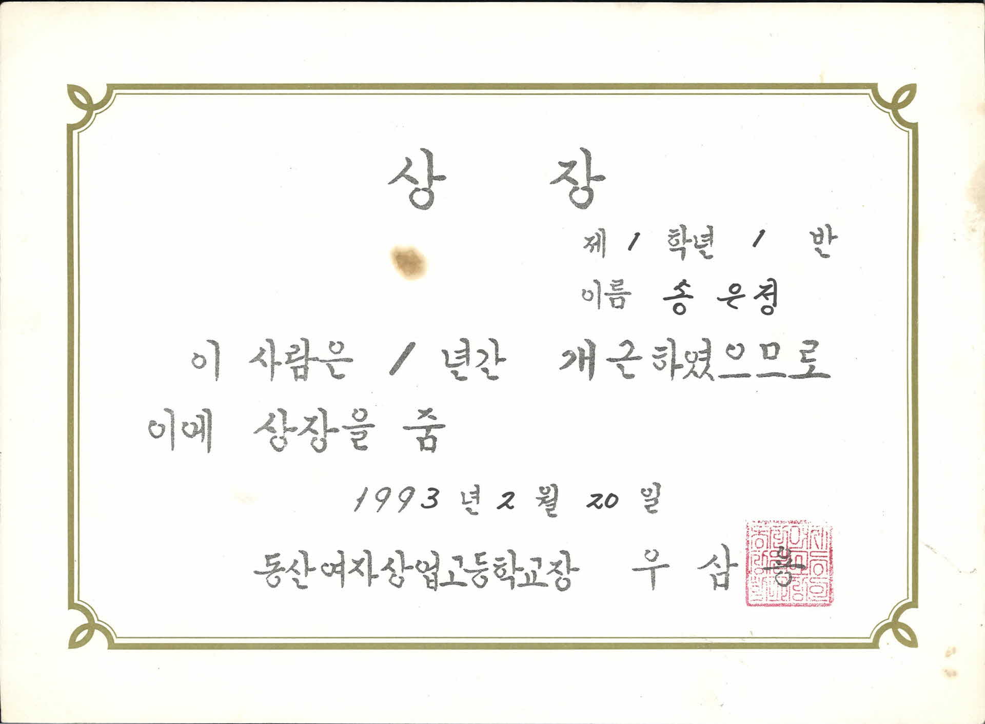 1993년 동산여상 1년 개근상
