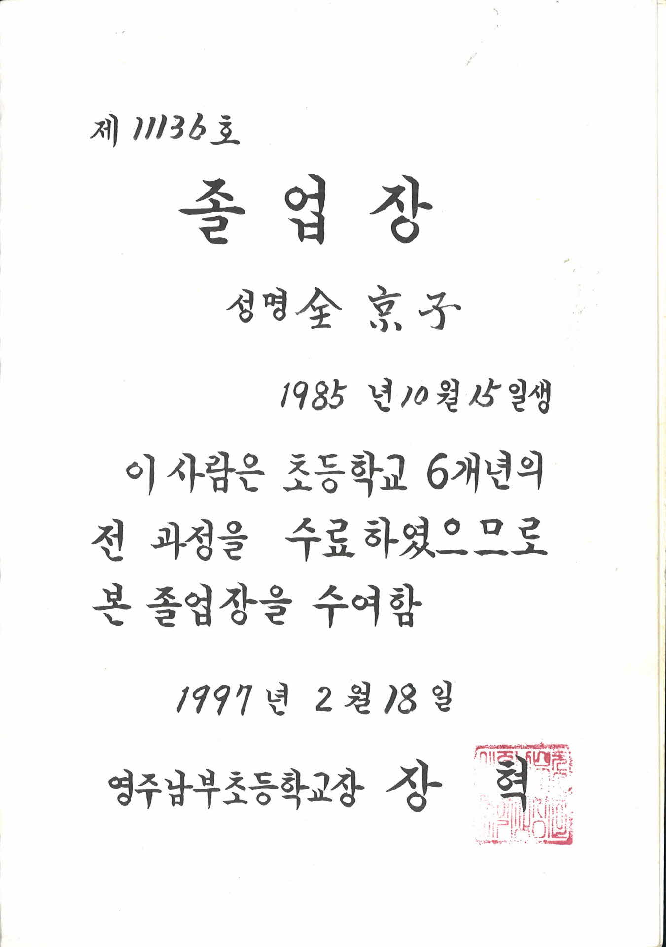 1997년 영주남부초등학교 졸업장