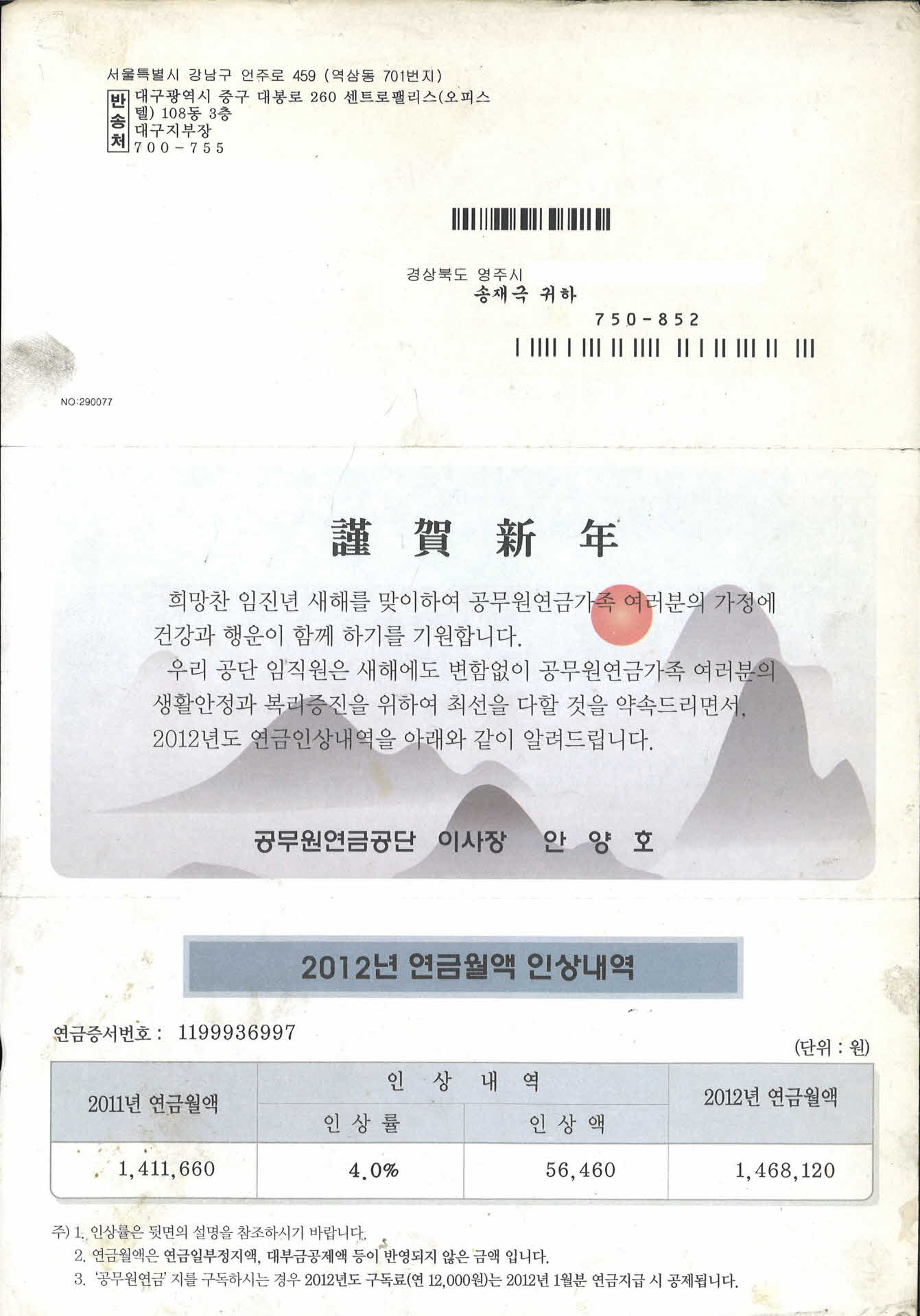 공무원 연금공단 연금인상 안내 우편물 > 영주, 영주사람