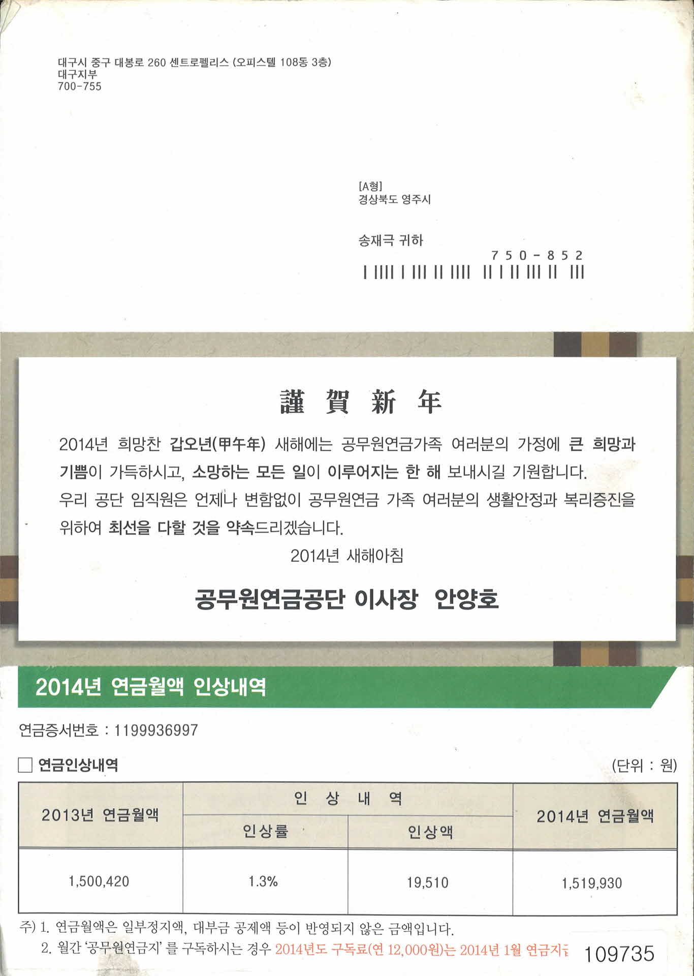| 기록물명 | 공무원 연금공단 연금인상 안내 우편물 | ||