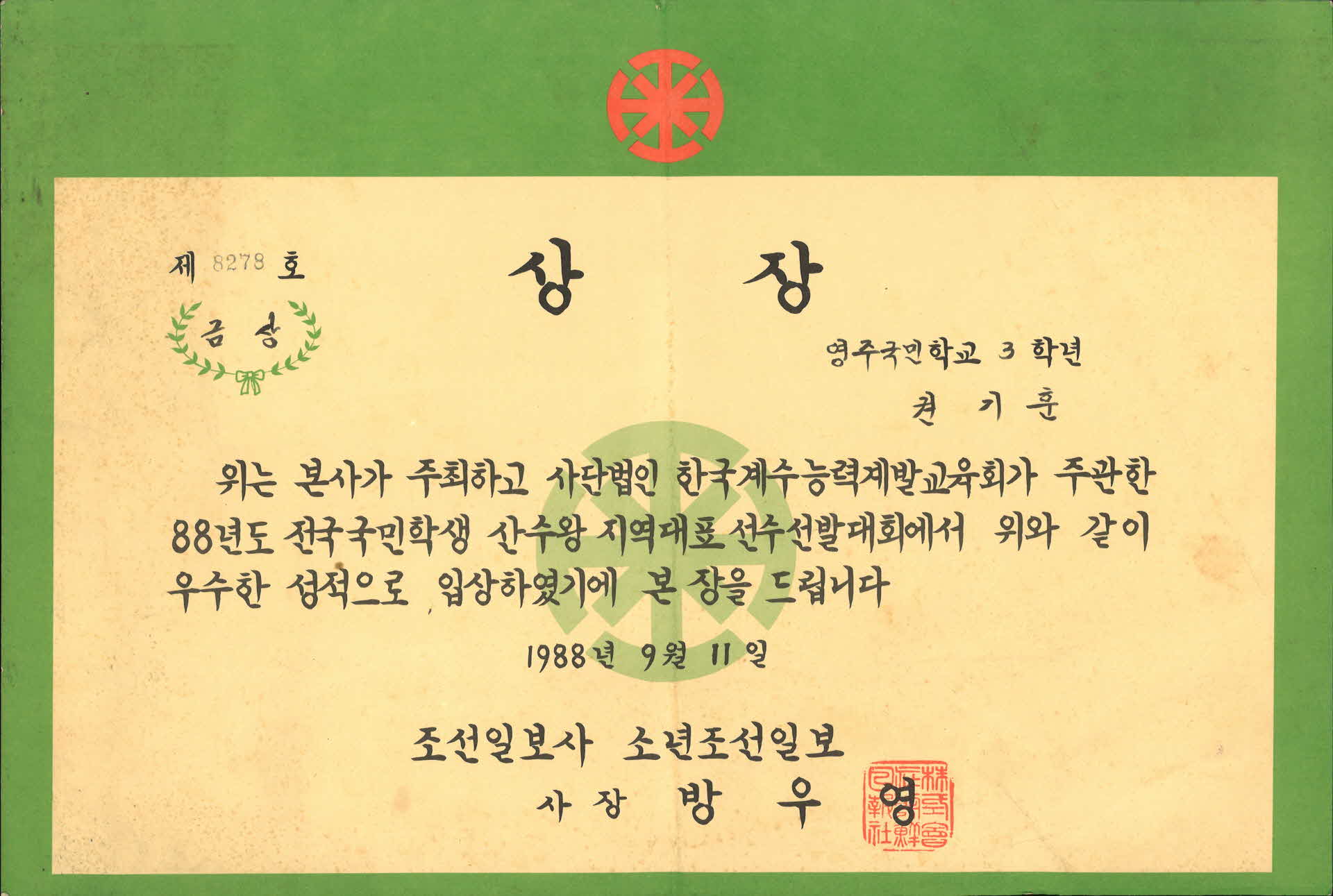 | 기록물명 | 국민학교 산수왕 지역대표 선발대회 상장 | ||