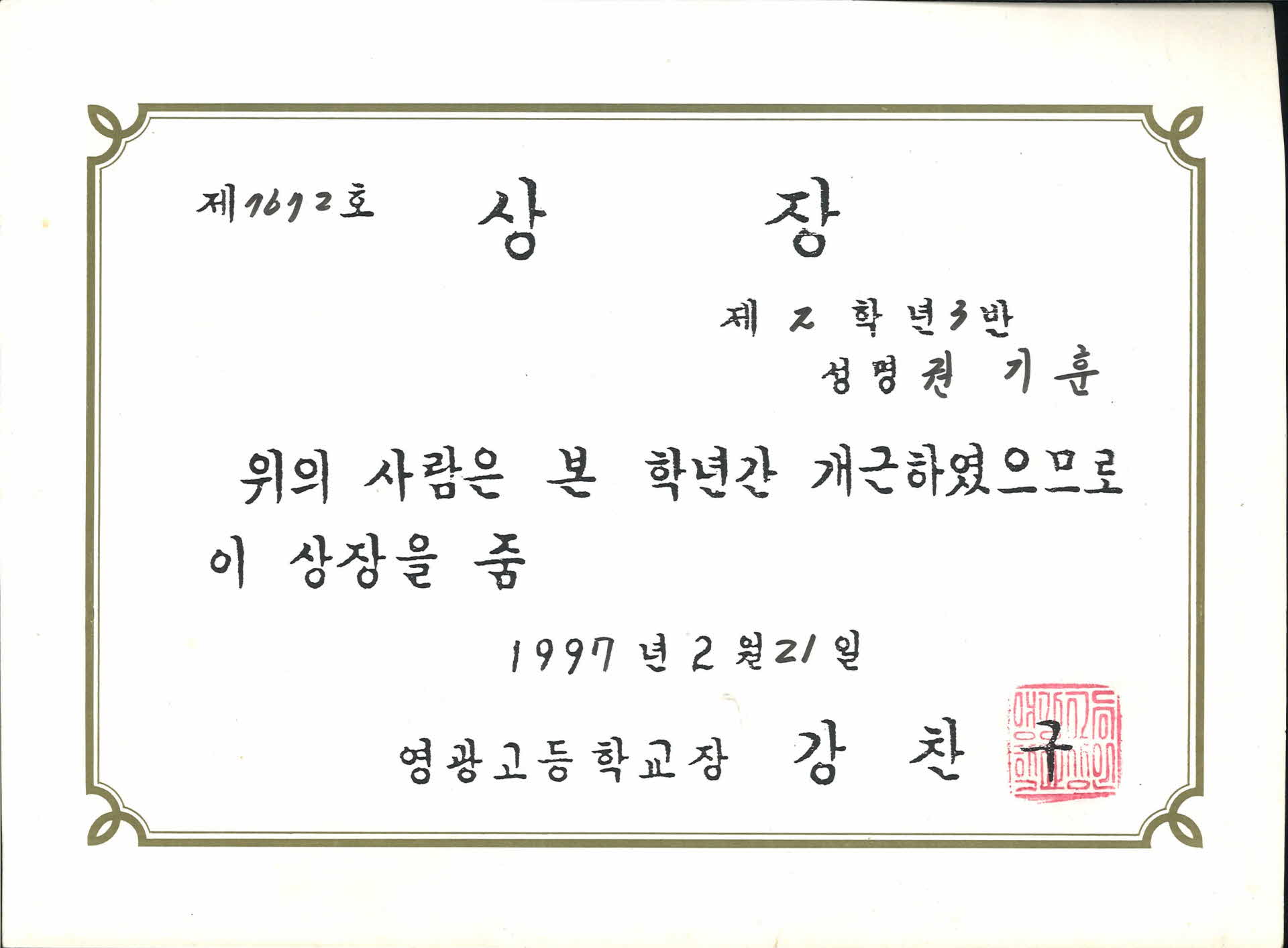 • 영광고등학교 개근 상장