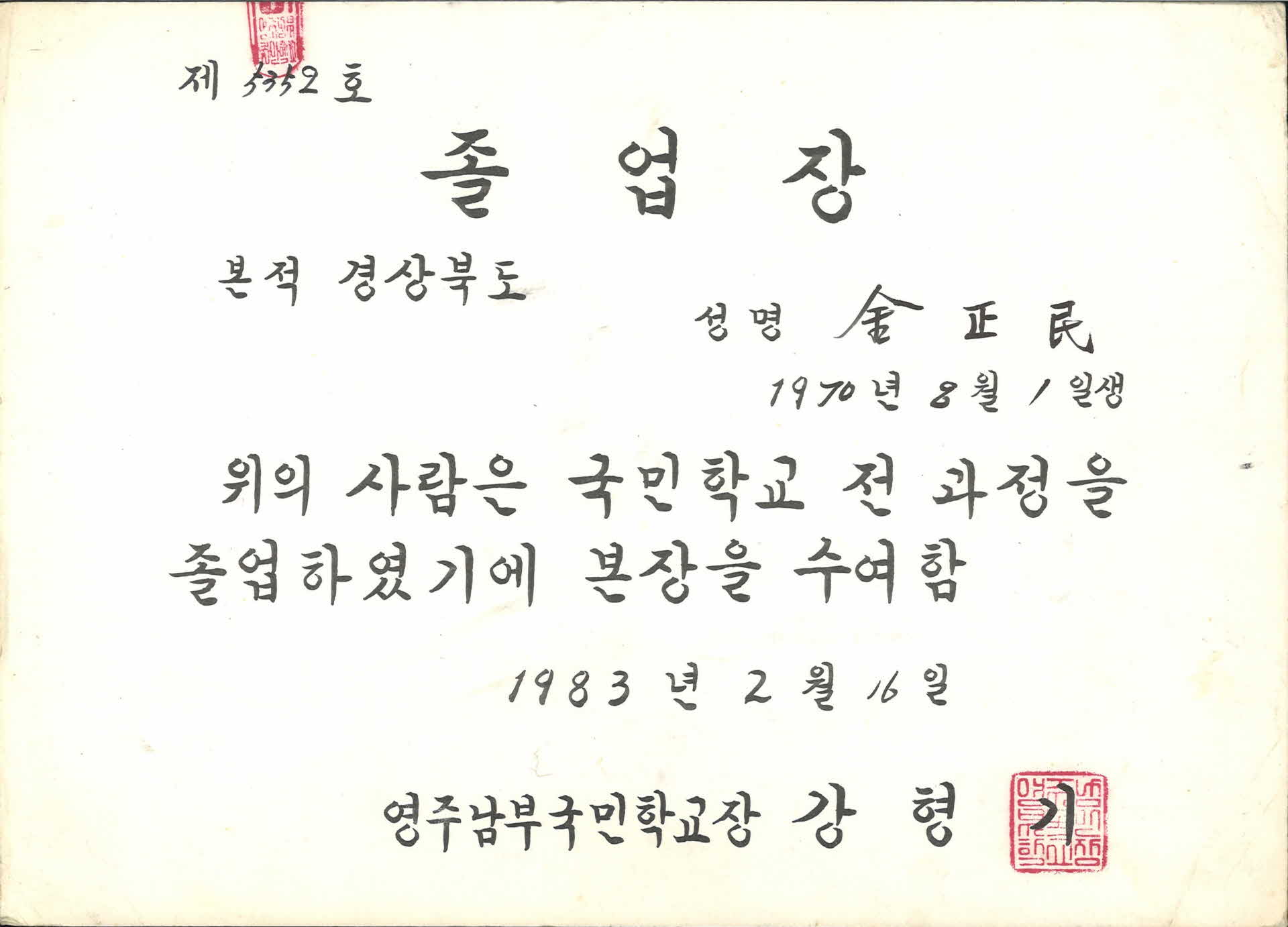 • 영주남부국민학교 국민학교 6년과정 졸업장