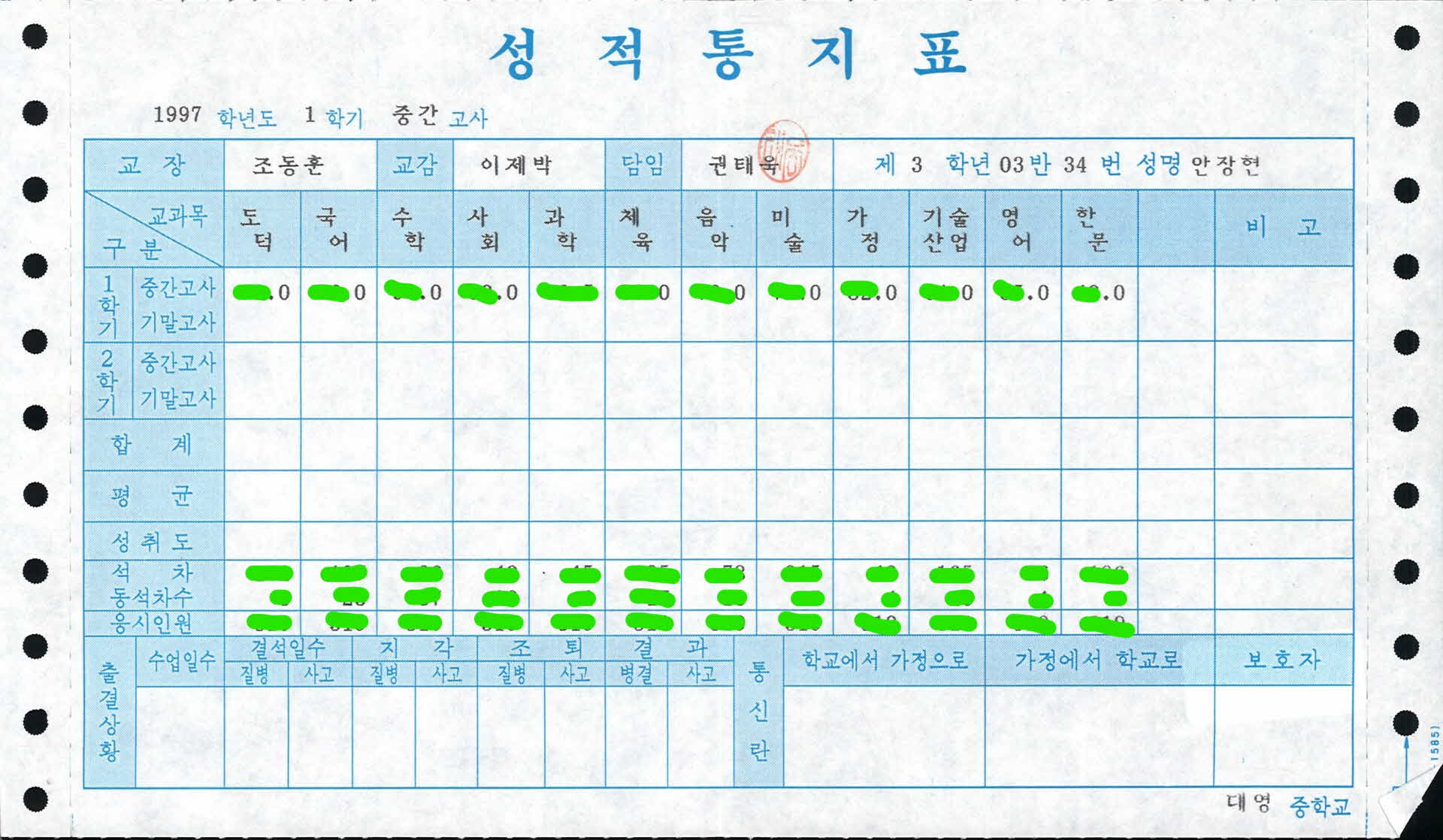 | 기록물명 | 1997년 대영중학교 중간고사 성적통지표 | ||
