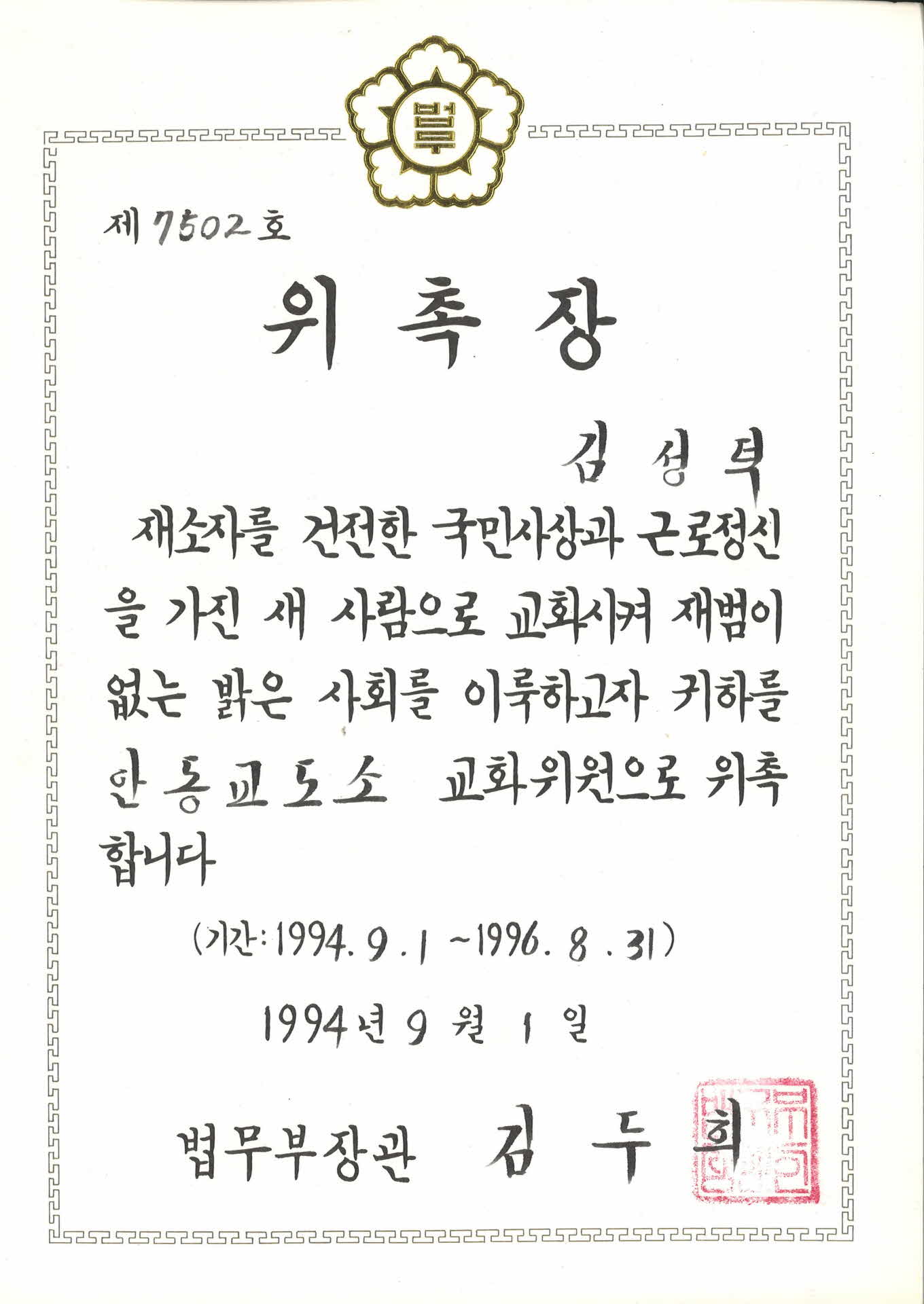 | 기록물명 | 안동교도서교화위원위촉장 | ||