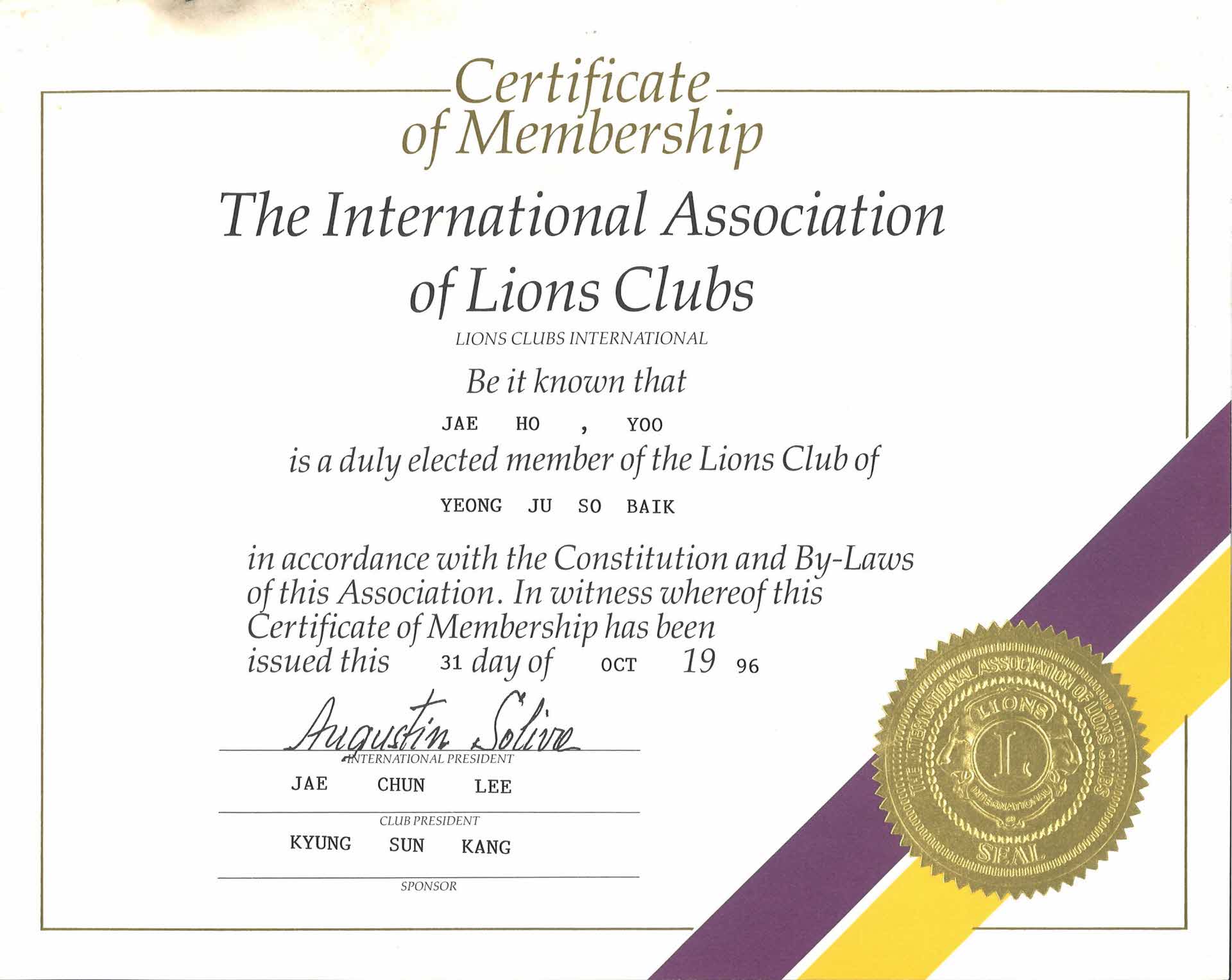 국제라이온스클럽 회원 증명서