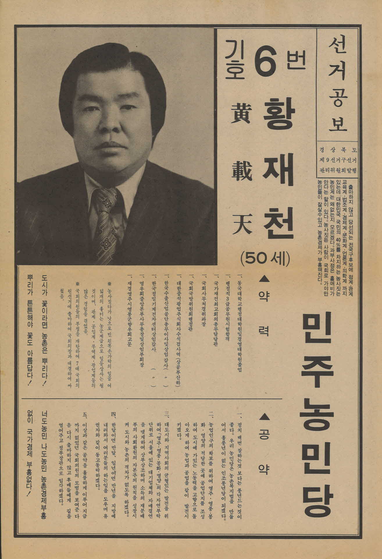 | 기록물명 | 황재천 민주농민당 총선 선거공보 | ||