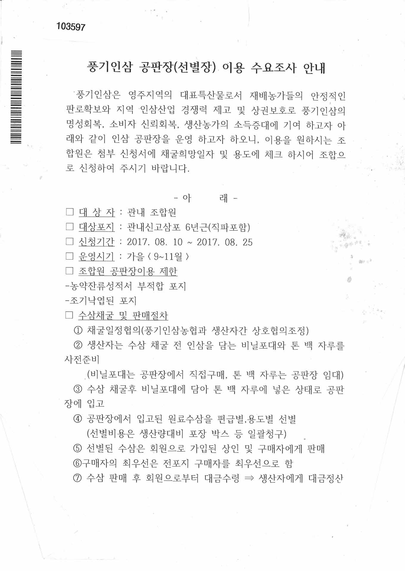 풍기인삼농협 풍기인삼 공판장 이용 수요조사 안내서