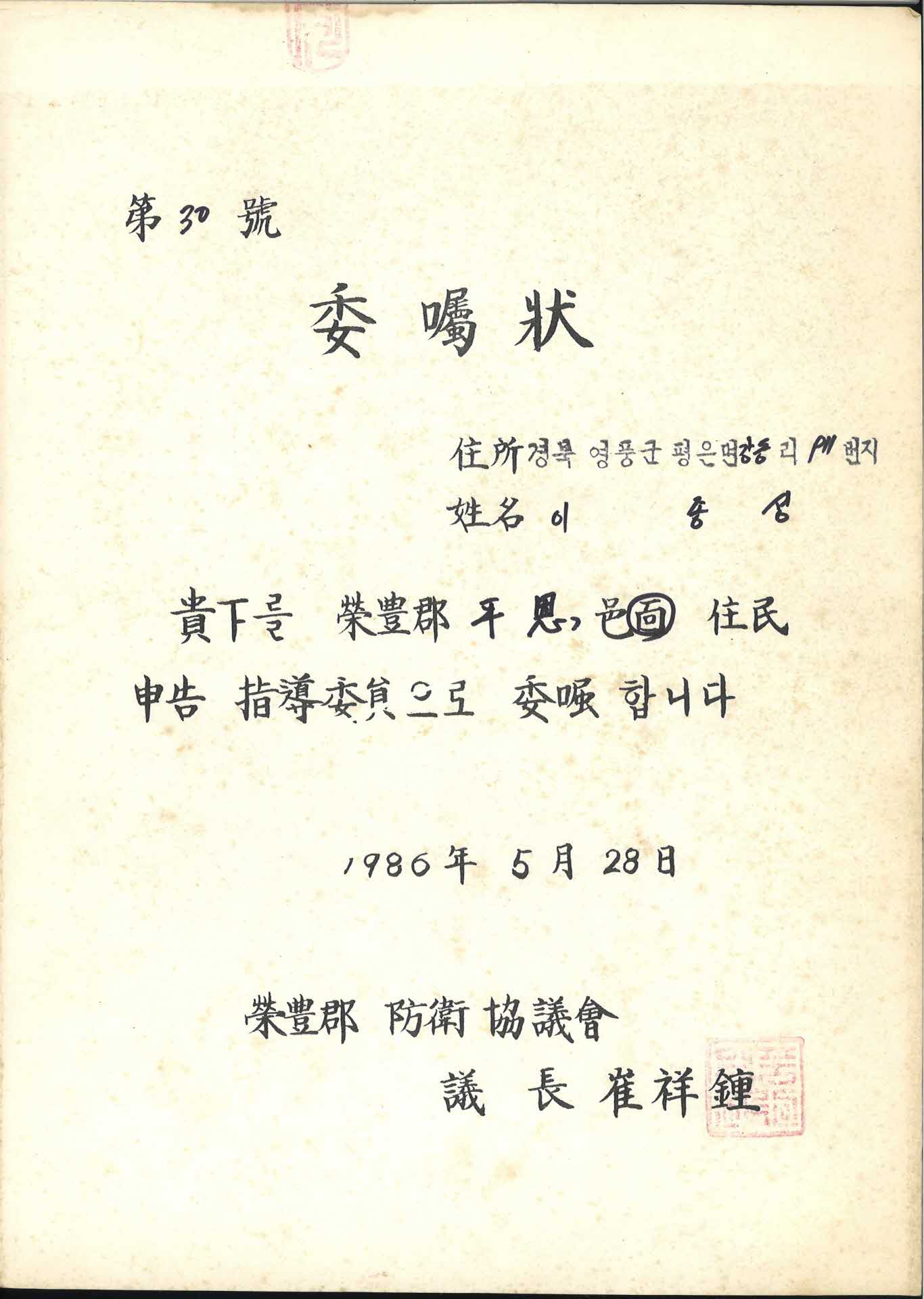 | 기록물명 | 평은면 주민신고 지도위원 위촉장 | ||