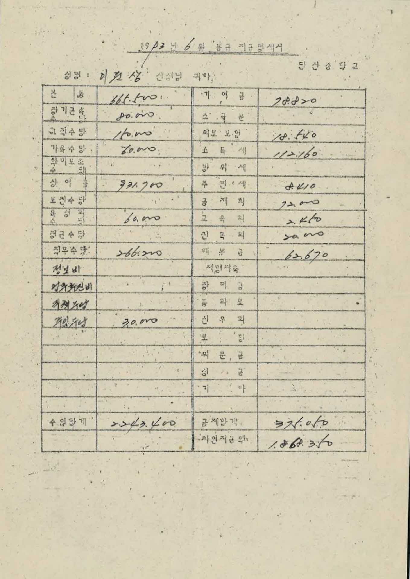 | 기록물명 | 1993년 6월 교사 봉급계산서 | ||
