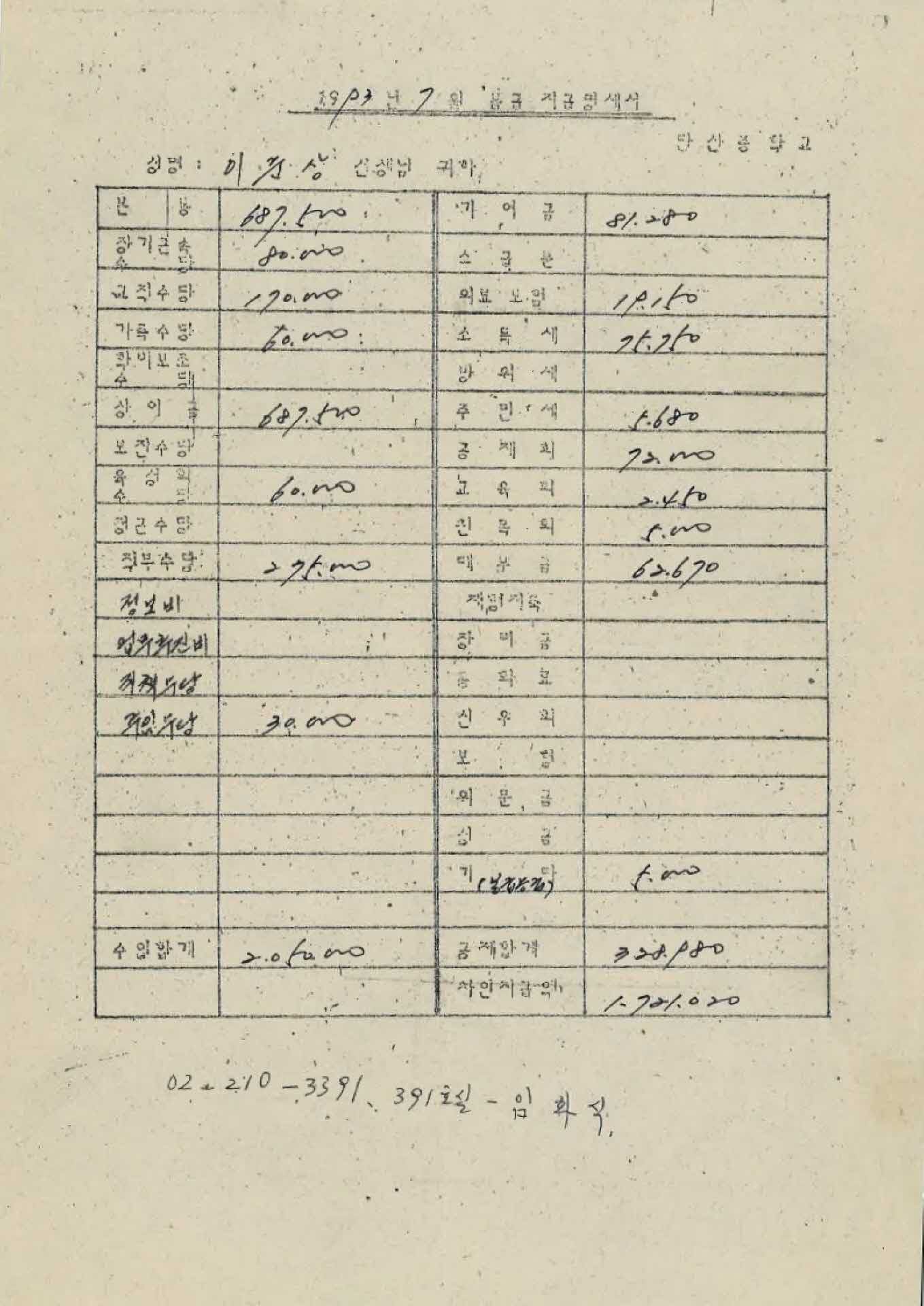 | 기록물명 | 1993년 7월 교사 봉급계산서 | ||