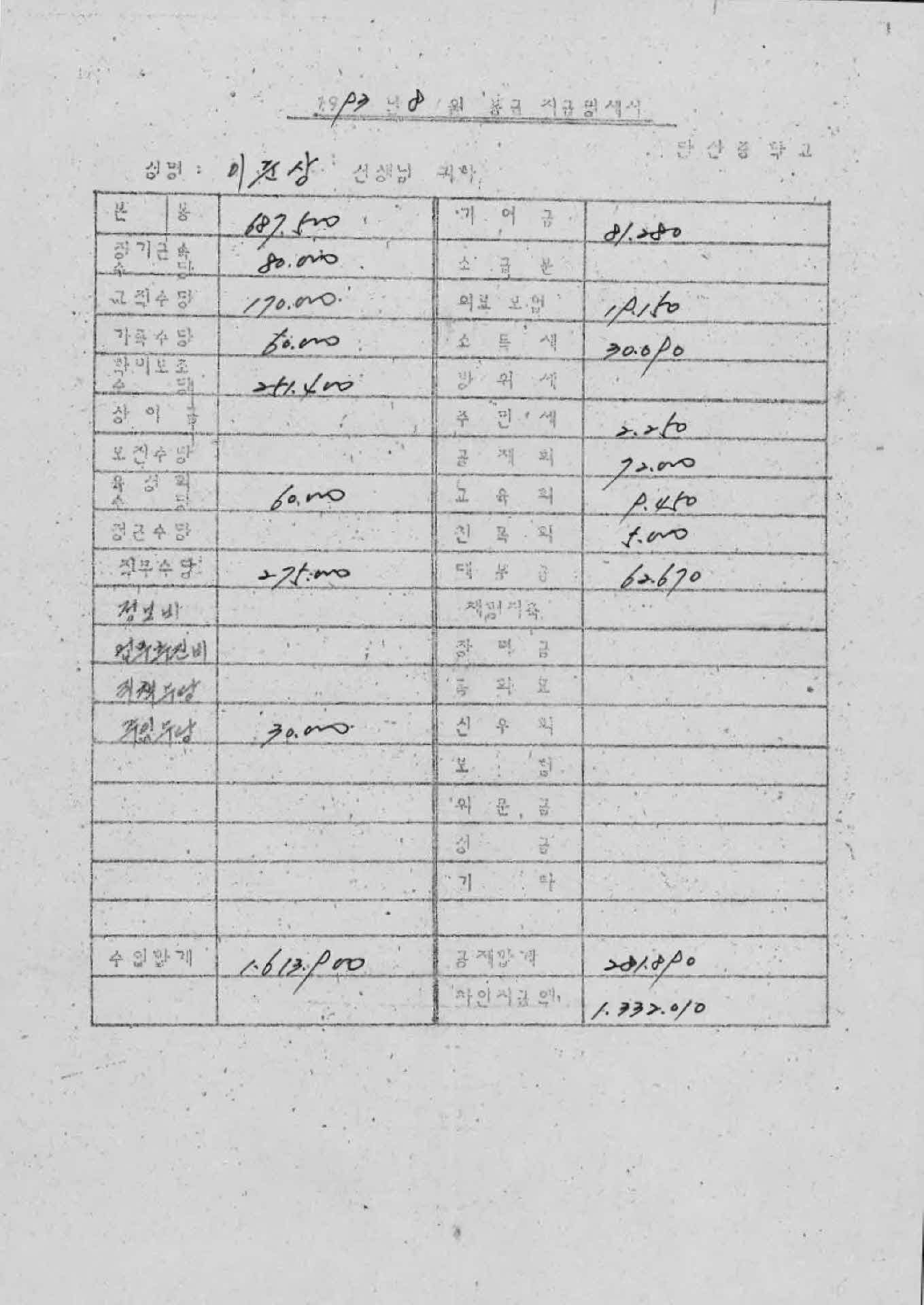 | 기록물명 | 1993년 8월 교사 봉급계산서 | ||