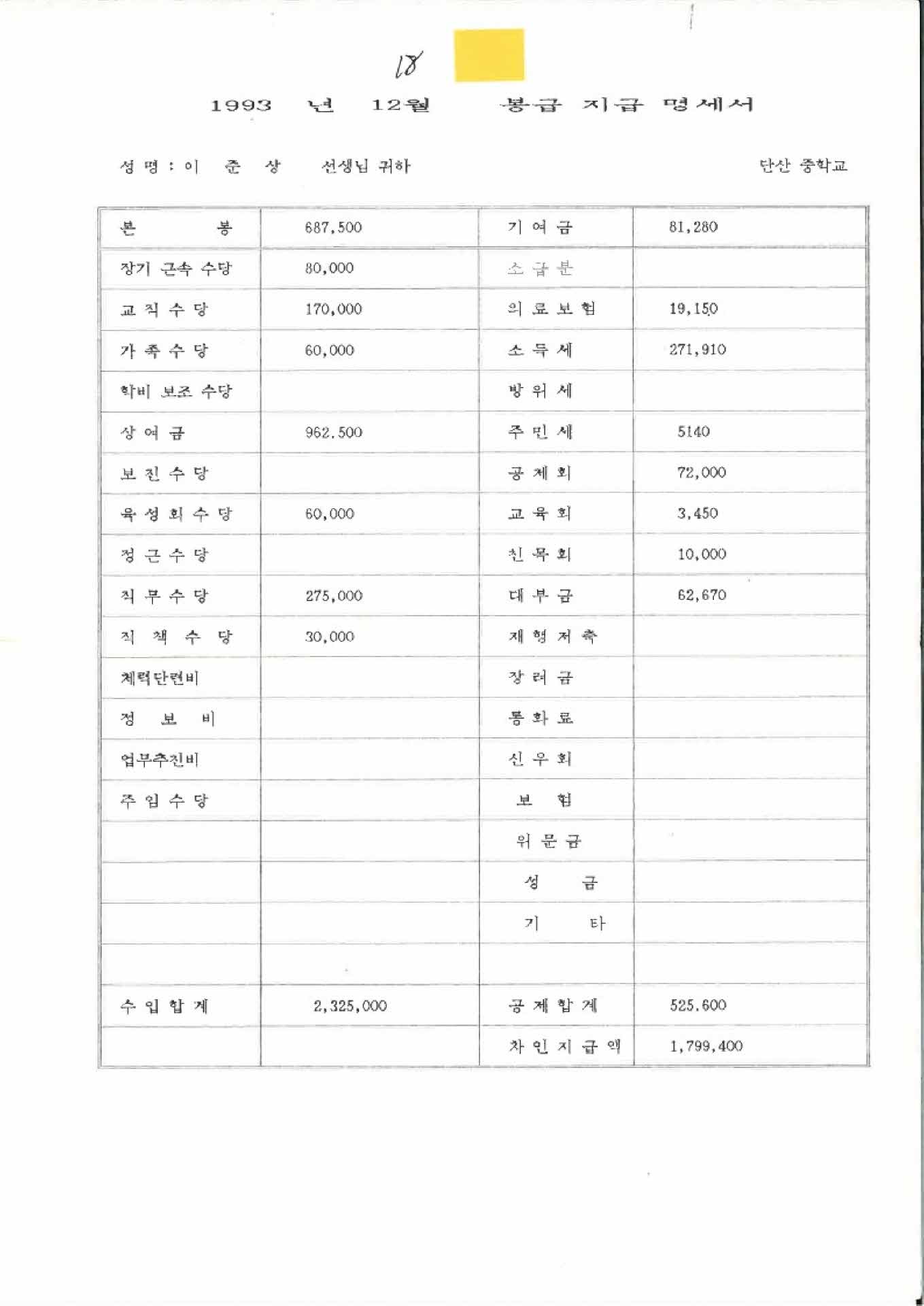 | 기록물명 | 1993년 12월 교사 봉급계산서 | ||