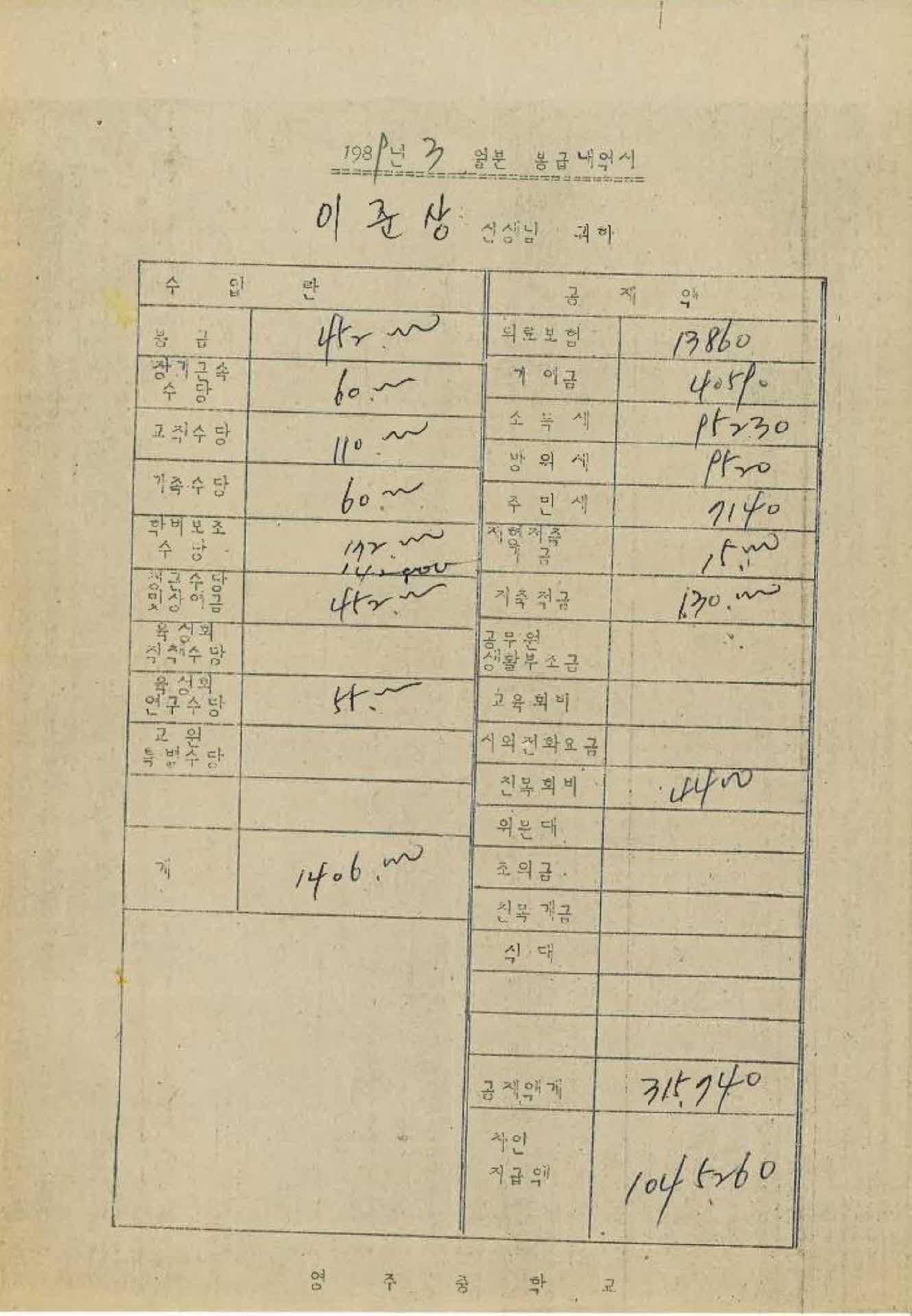 | 기록물명 | 1989년 3월 교사 봉급계산서 | ||
