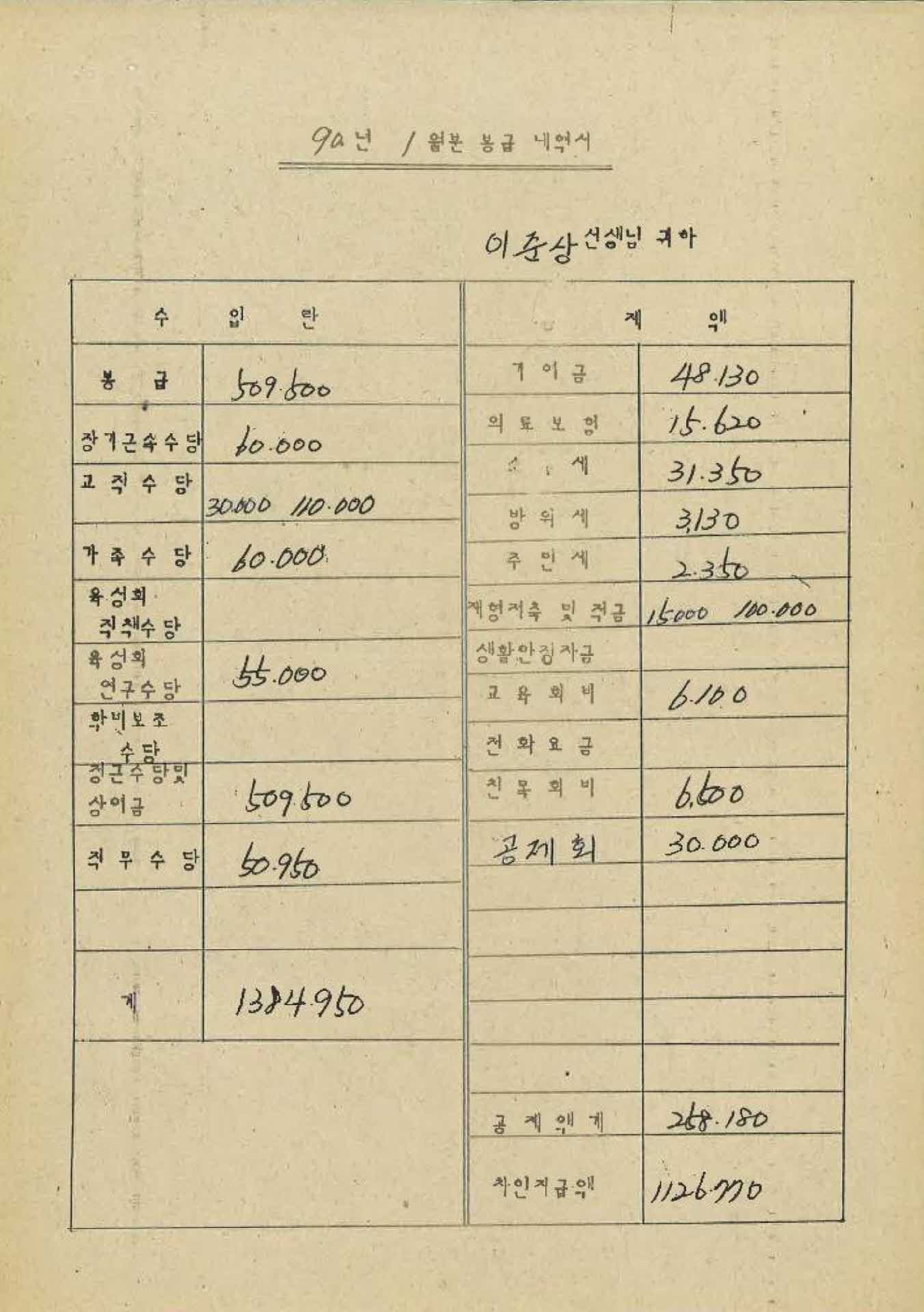 | 기록물명 | 1990년 1월 교사 봉급계산서 | ||