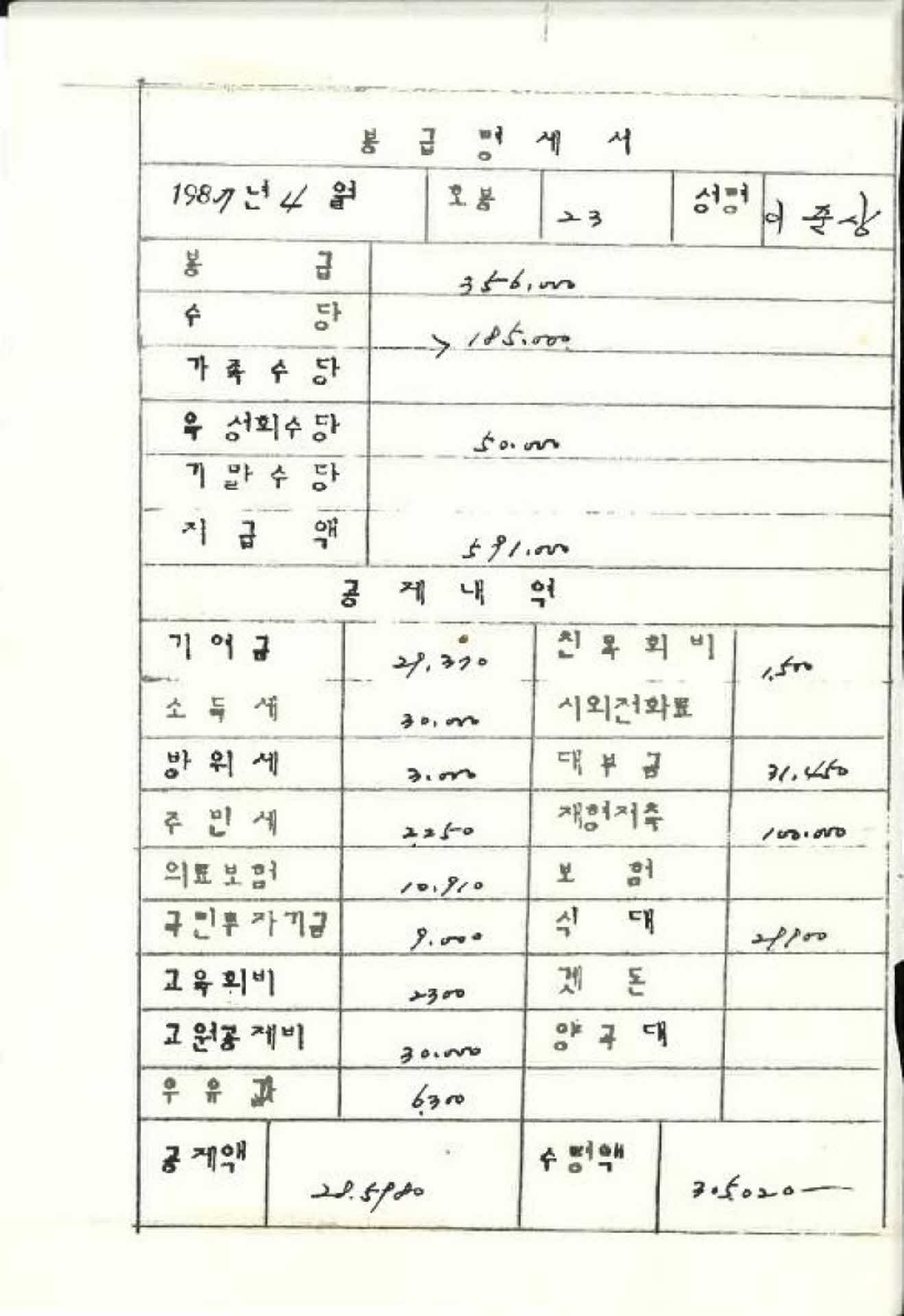 1987년 4월 교사 봉급계산서