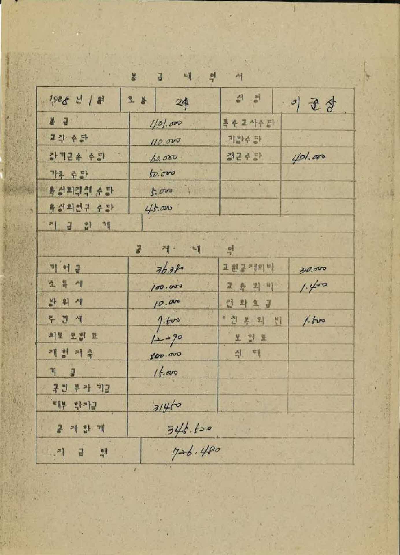 | 기록물명 | 1988년 1월 교사 봉급계산서 | ||