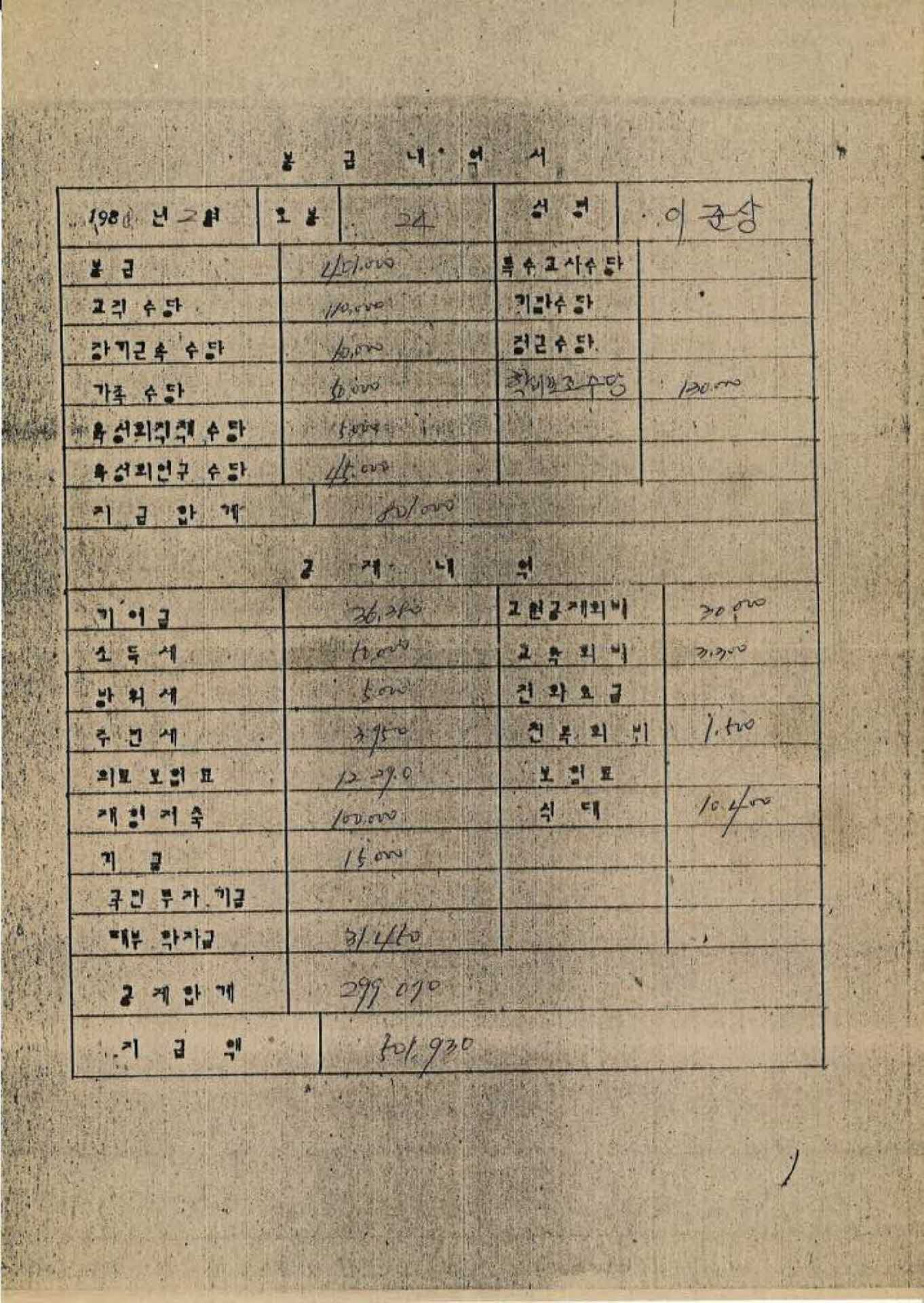 | 기록물명 | 1988년 2월 교사 봉급계산서 | ||