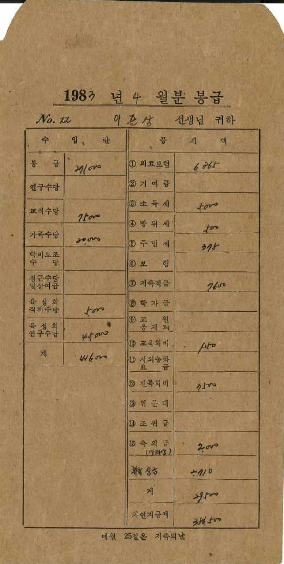 | 기록물명 | 1983년 4월 교사 봉급계산서 봉투 | ||