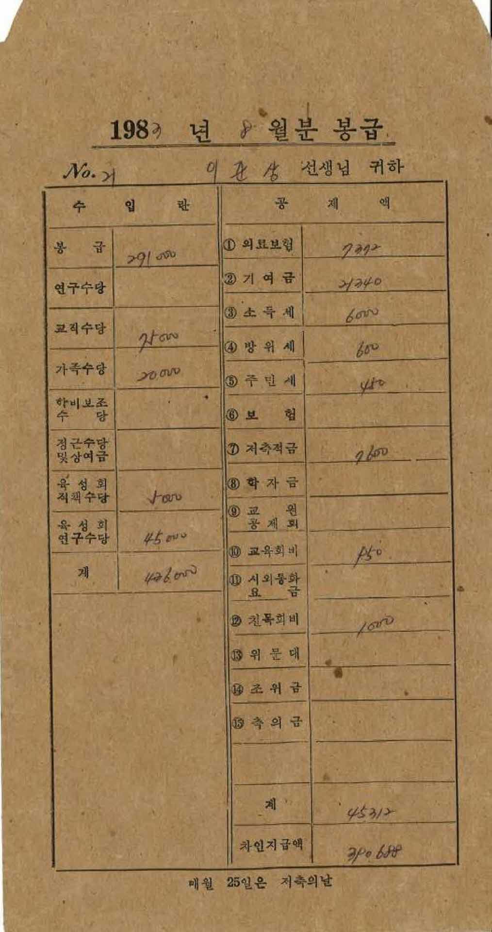 | 기록물명 | 1983년 8월 교사 봉급계산서 봉투 | ||