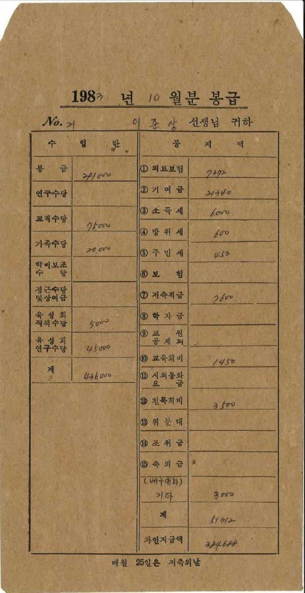 | 기록물명 | 1983년 10월 교사 봉급계산서 봉투 | ||