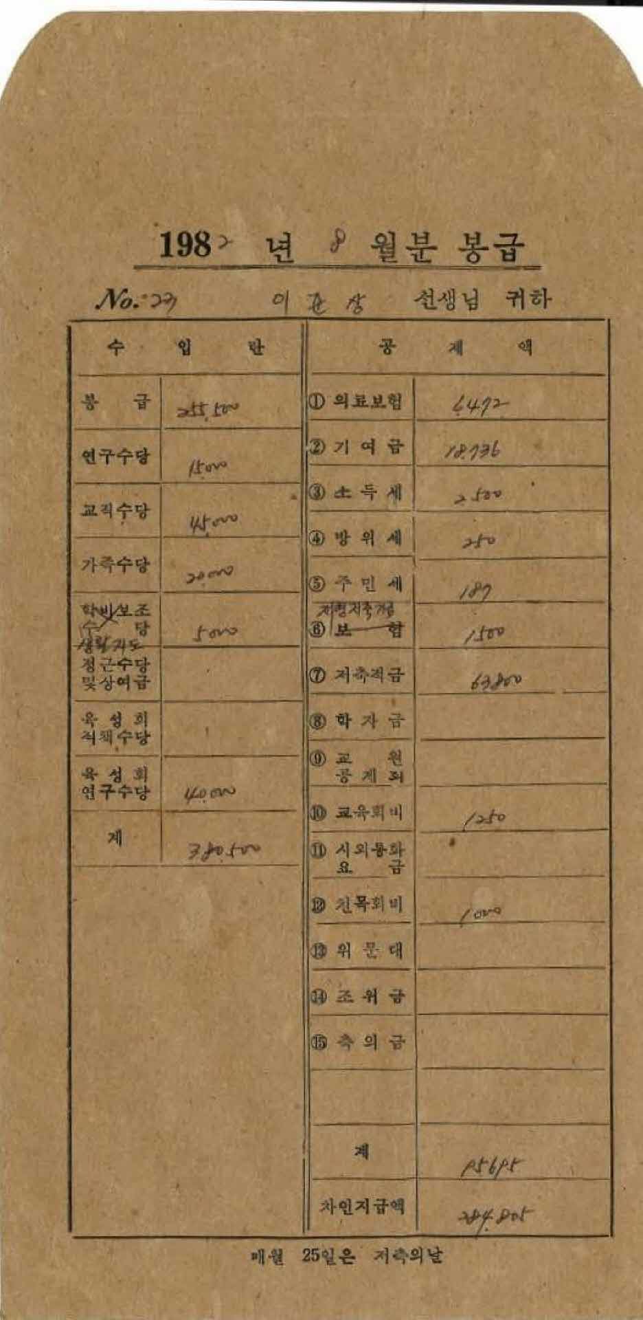 | 기록물명 | 1982년 8월 교사 봉급계산서 봉투 | ||