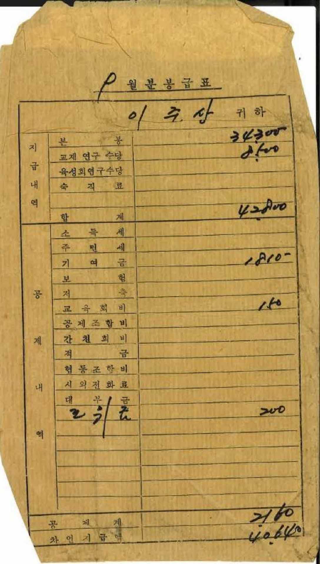 | 기록물명 | 1974년 9월 교사 봉급계산서 봉투 | ||