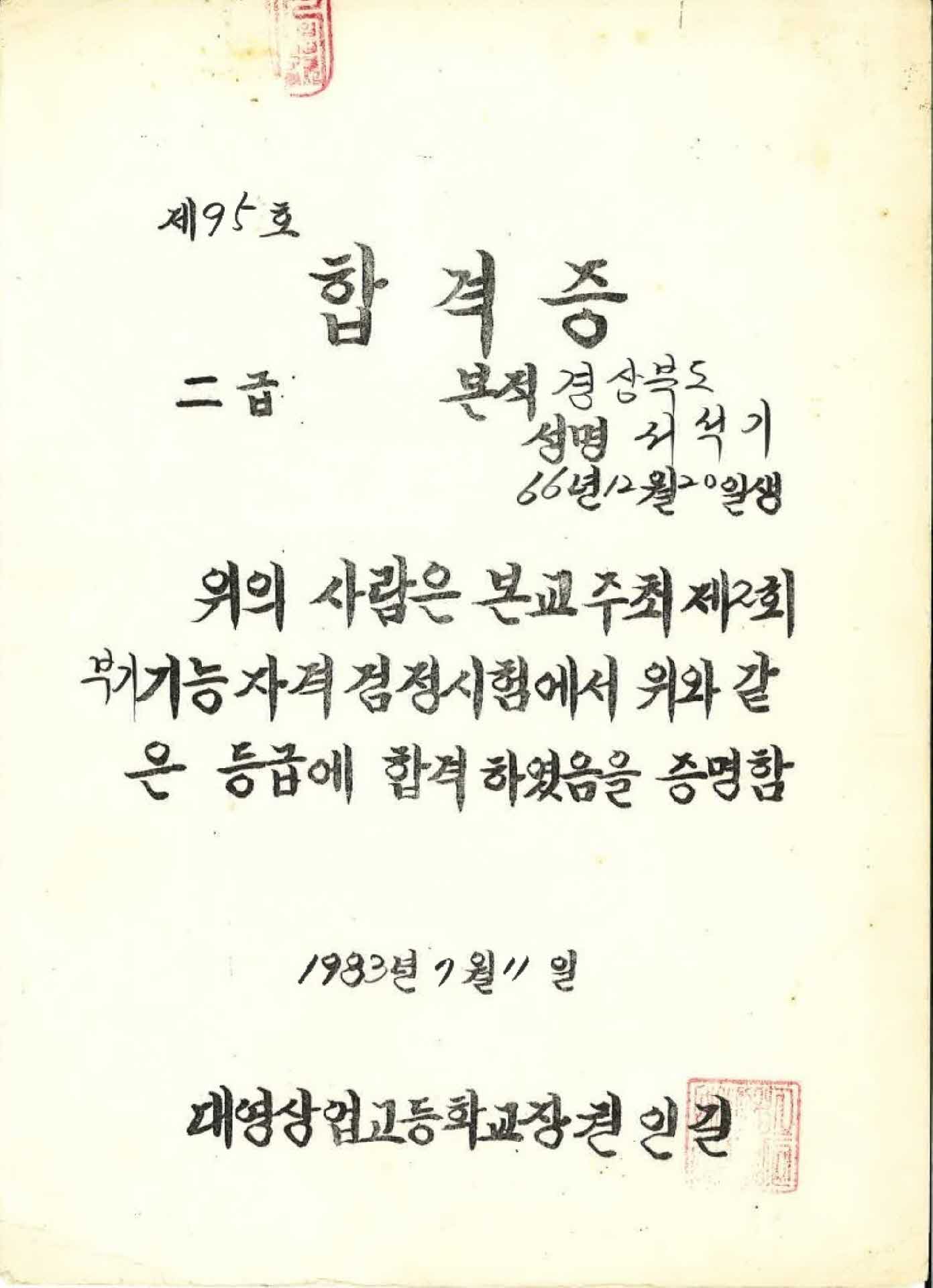 대영상고 부기2급시험 합격증