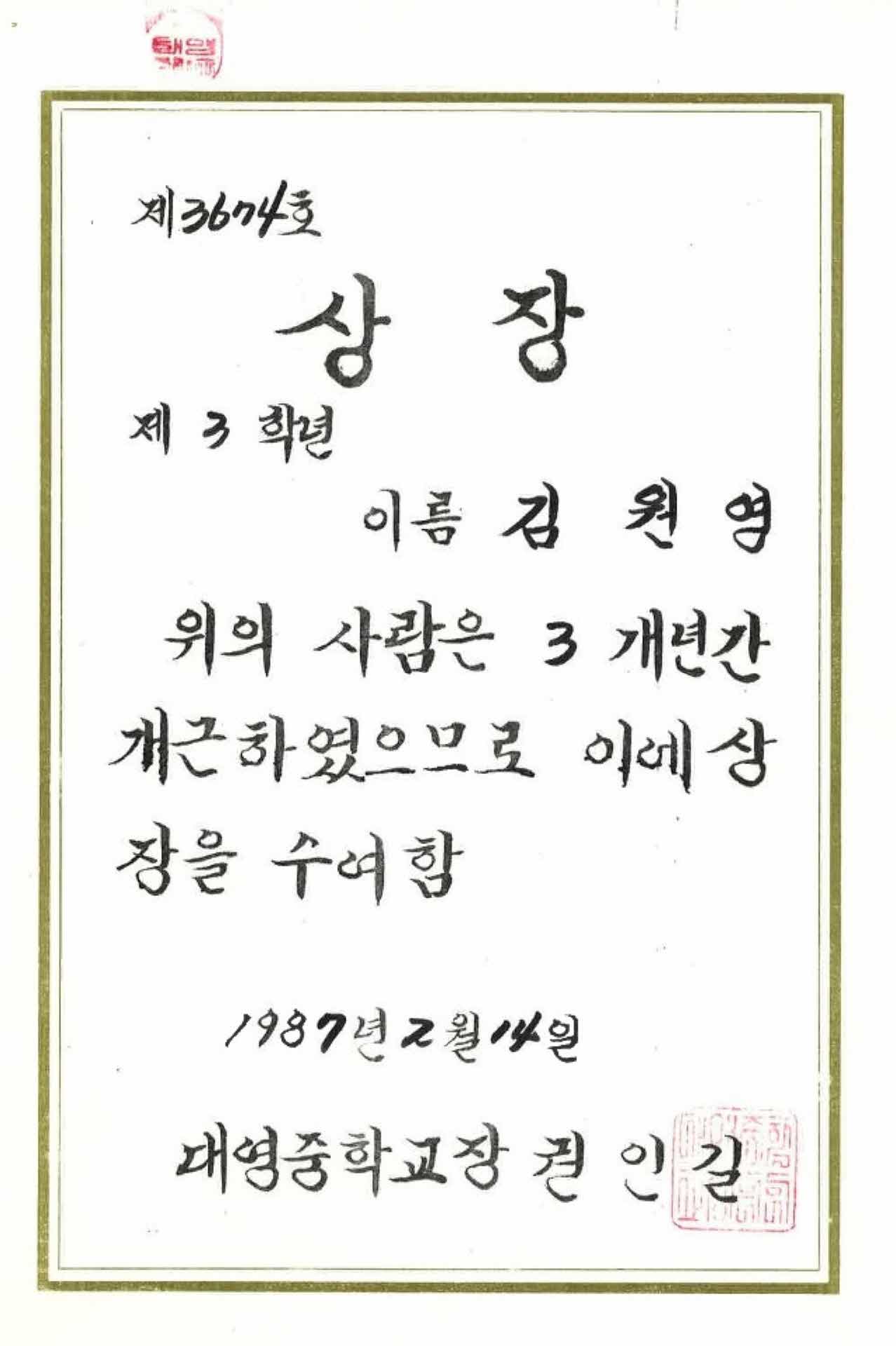 | 기록물명 | 1987년 대영중 3년 개근상 | ||