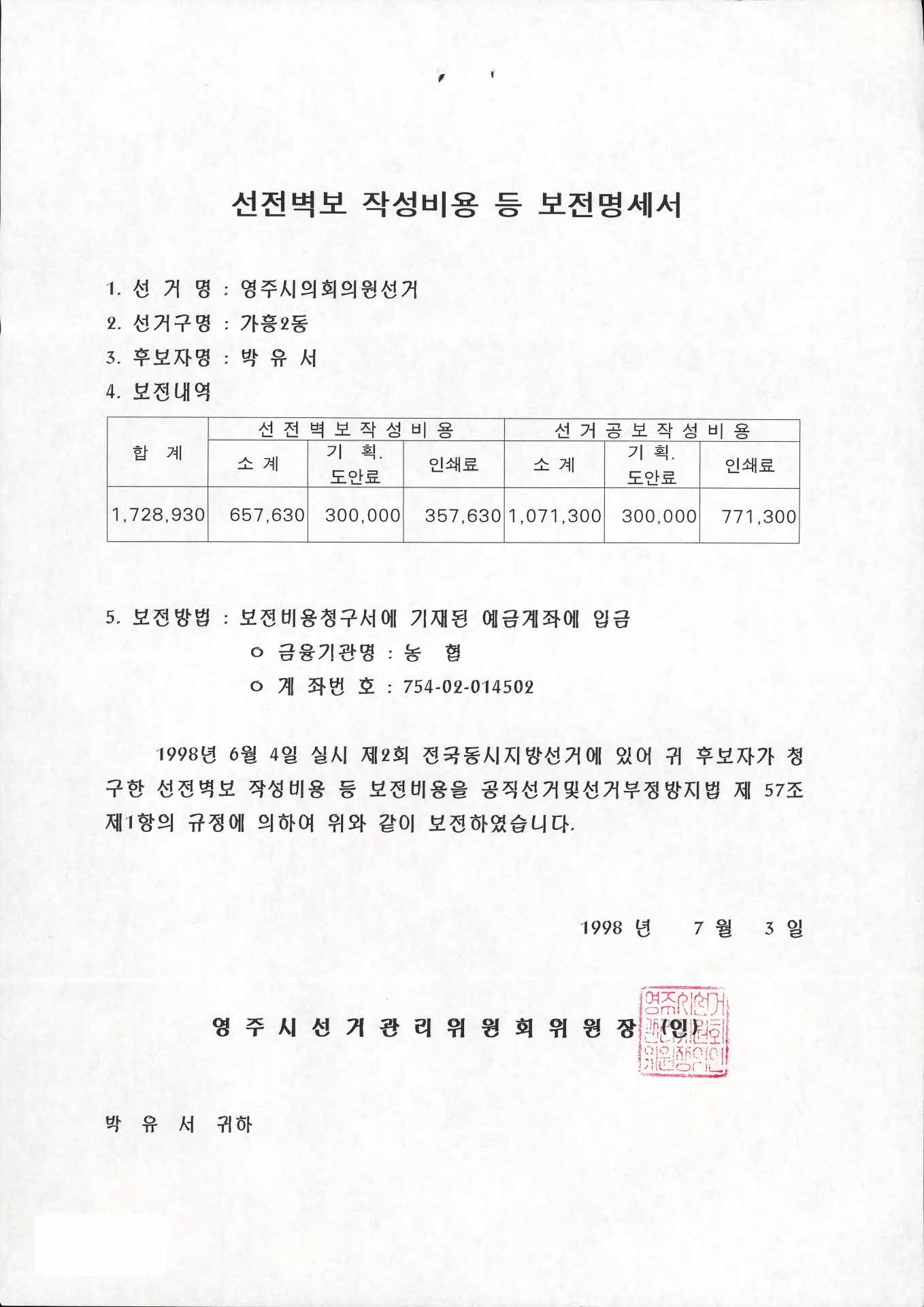 선전벽보 작성비용 등 보전명세서