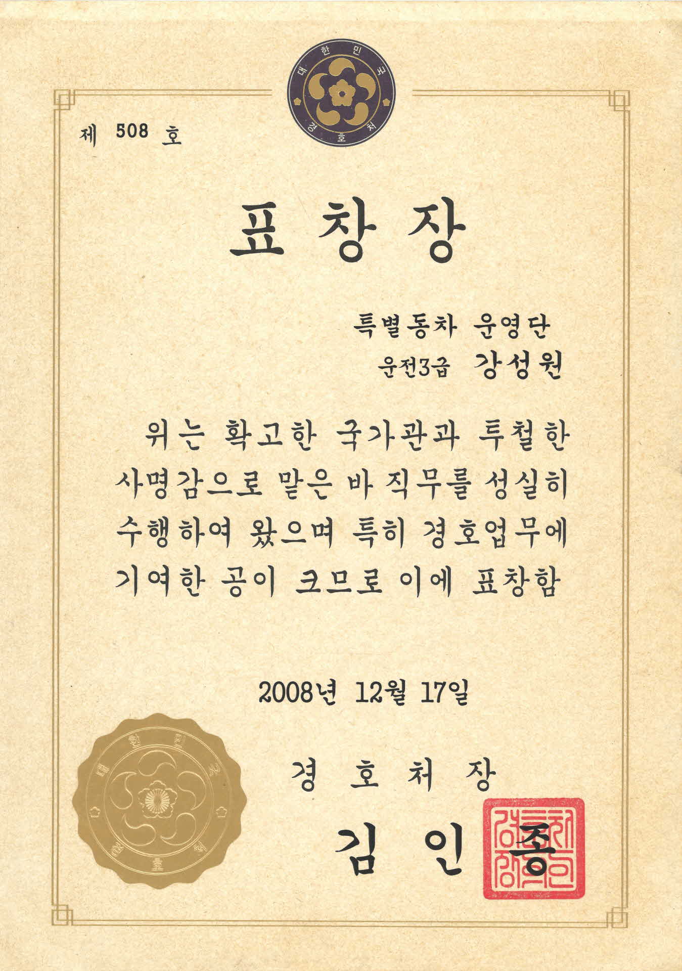 | 기록물명 | 특별동차 운영단 경호업무 기여 표창장 | ||