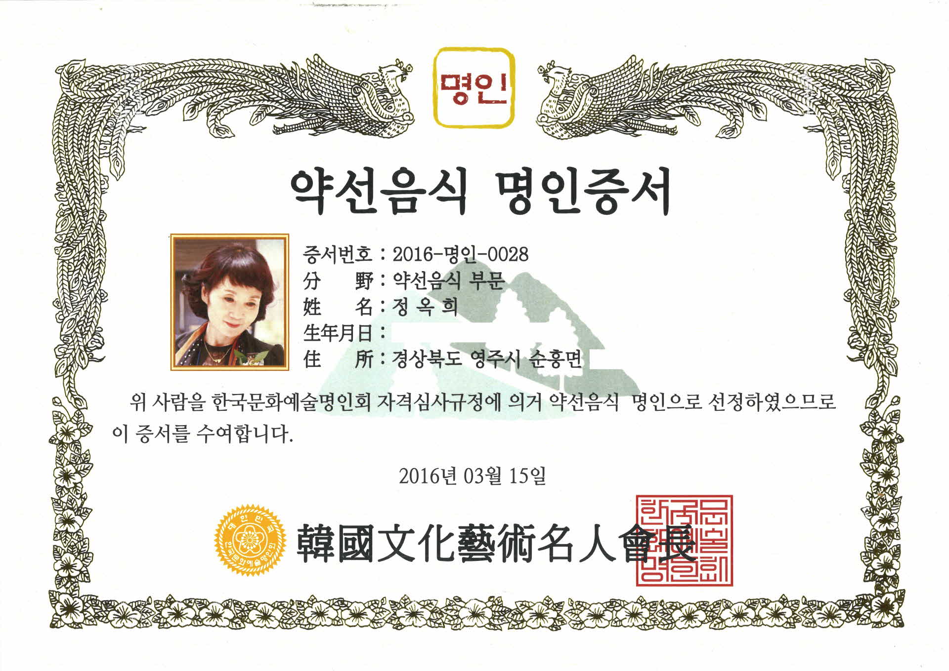 | 기록물명 | 약선음식 명인증서 | ||