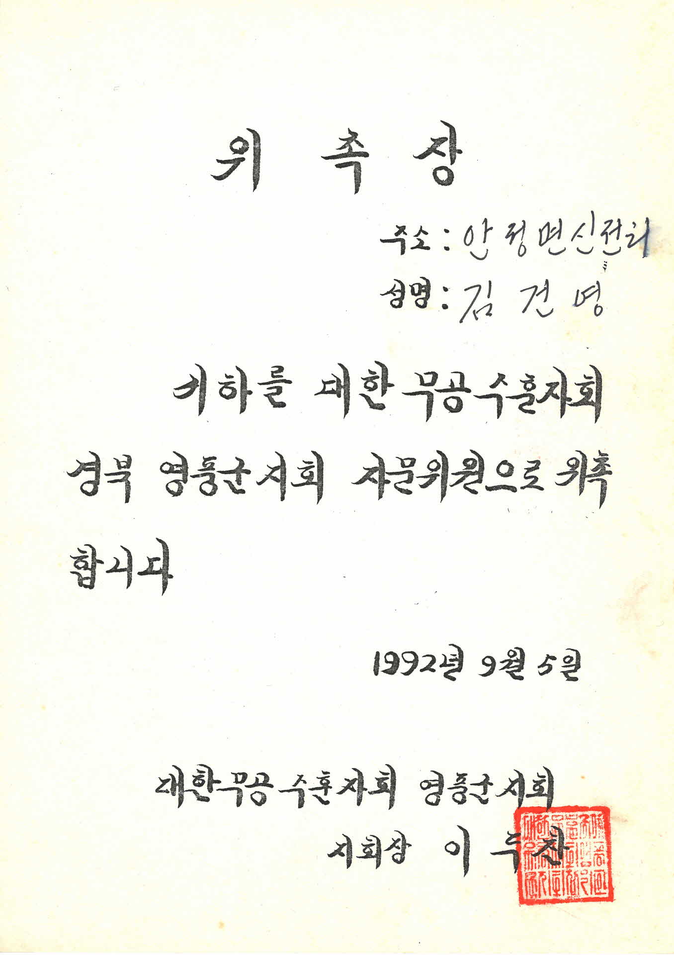 | 기록물명 | 대한무공수훈자회 경북 영풍군지회 자문위원 위촉장 | ||